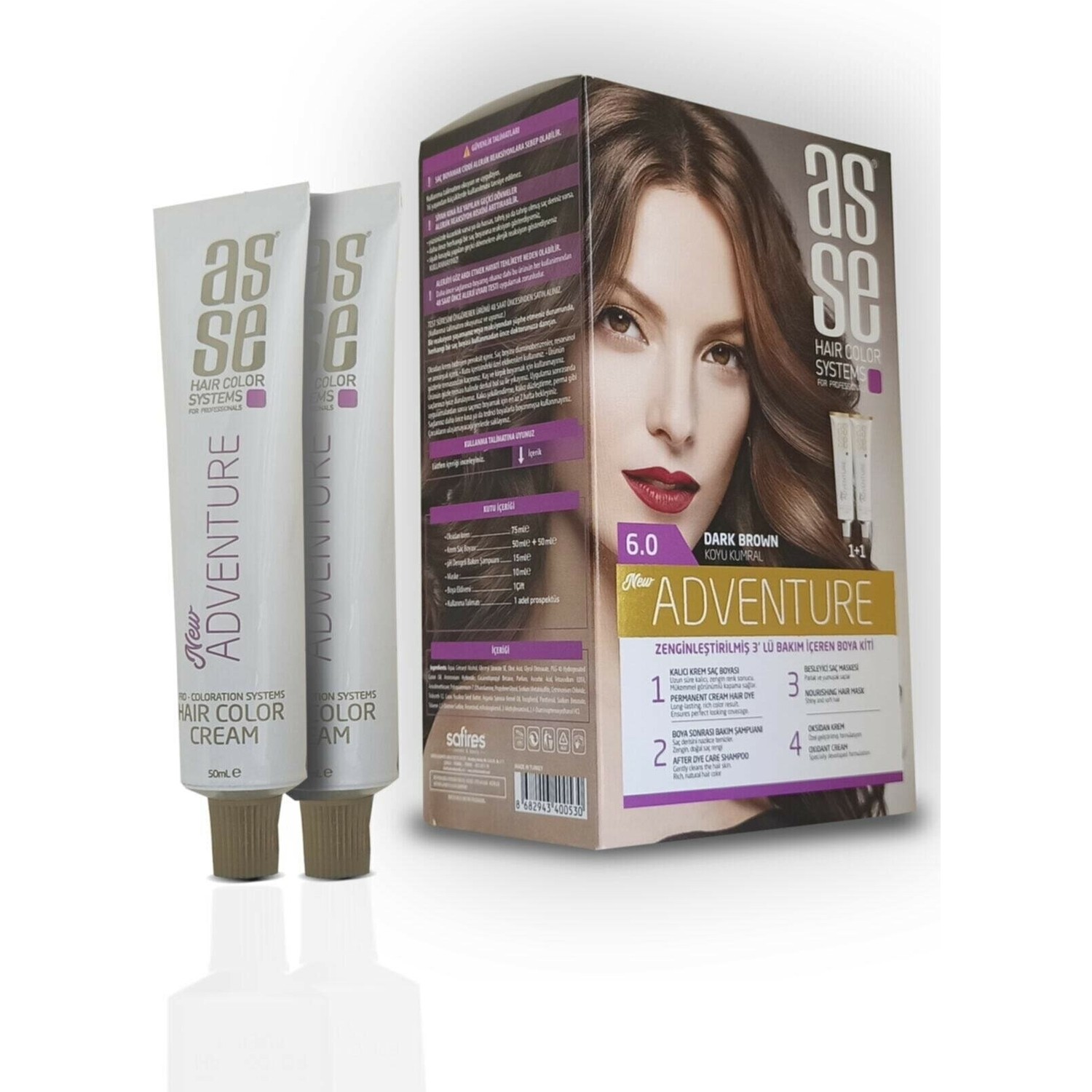 ASSE krem boya, saçta lüks renkler için zengin ve kökten uca nüfuz eden etkili renk pigmentleri içeren bir formüle sahiptir. Kalıcı krem saç boyası, mükemmel beyaz kapama özelliği ile saça yoğun bir renk verir. Özel içeriği ile saçınıza daha fazla boyayı hapsederek saç renginin uzun süre kalıcılığını artırır. Doğal, canlı ve uzun süre kalıcı renkler sunar. Hoş parfümlü ve kadifemsi kremi uygulama sırasında optimum konfor sunar. Set Boya Kutu İçeriği: 2 Adet Tüp Krem Saç Boyası ,1 Adet Oksidasyon Krem ,1 Adet Saç Bakım Kremi, 1 Adet Saç Bakım Şampuanı , 1 Çift Eldiven vardır.Kullanma Kılavuzuda vardır.